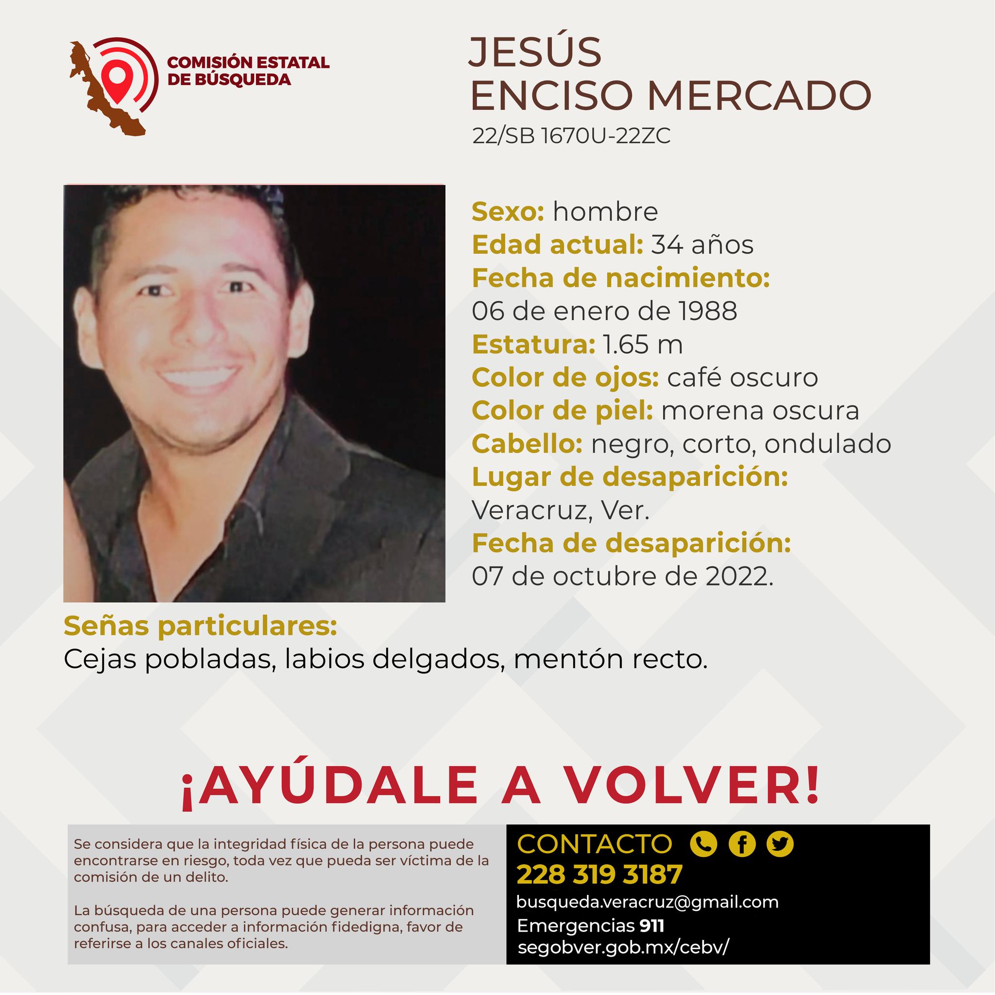 Veracruz, Ver. Amigos y familiares de Jesús Enciso Mercado, de 34 años, han lanzado una campaña para solicitar ayuda a través de redes sociales para dar con su paradero.