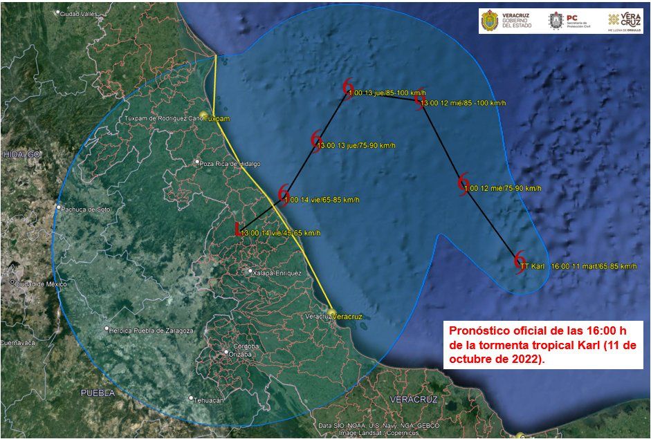 La figura muestra el pronóstico oficial de las 16:00 horas de la trayectoria que podría seguir Karl en los próximos días.