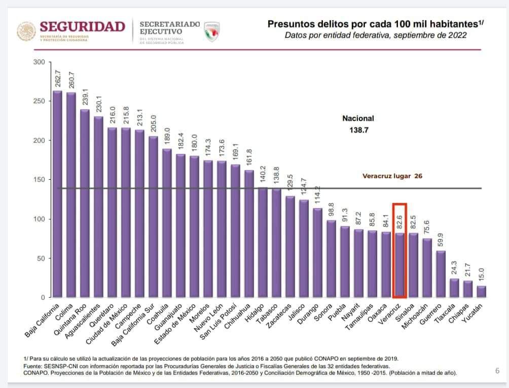 De acuerdo al Sistema Nacional de Seguridad Pública en materia delitos por cada 100 mil habitantes, Veracruz ocupa la posición número 26; es decir, es de las 10 entidades más seguras.
