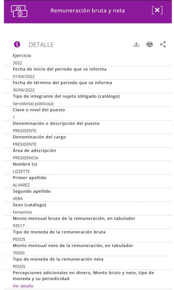 Sin embargo, según el Portal Nacional de Transparencia, datos que son públicos para todos los ciudadanos, el salario bruto de la edil es de 93 mil 517, y recibe un monto total, neto, de 70 mil pesos mensuales.