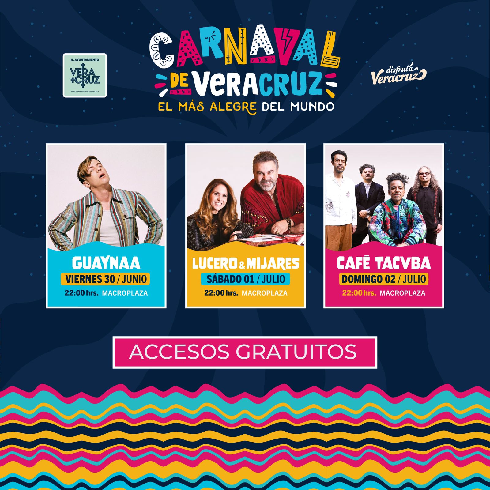 La alcaldesa Paty Lobeira de Yunes reiteró que todos los conciertos serán totalmente gratuitos y se realizarán a las 10 de la noche en la Macroplaza del Malecón. “Estoy segura que los conciertos serán todo un éxito pues es una gran cartelera artística la que estamos presentando”.