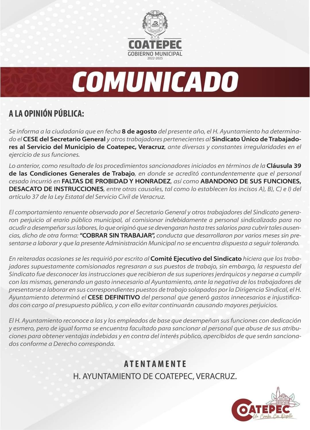 XALAPA, VER.- El presidente municipal de Coatepec, el morenista Raymundo Andrade Rivera, este miércoles dio por por terminada toda relación laboral con el secretario general del sindicato único de trabajadores al servicio del ayuntamiento, José Luis Hernández Hernández y a otros miembros, acusándolos de cobrar sin trabajar.
