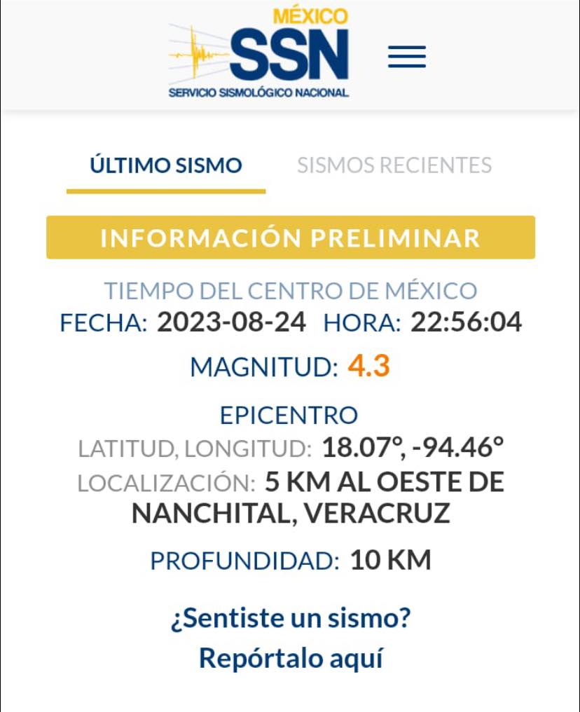 El ayuntamiento de Nanchital escribió en su cuenta de Facebook: “#HaceUnosMomentos se registró un sismo al oeste de nuestro municipio; esta es la magnitud preliminar que informa el Sismológico Nacional. Hasta el momento, no se registran afectaciones”.