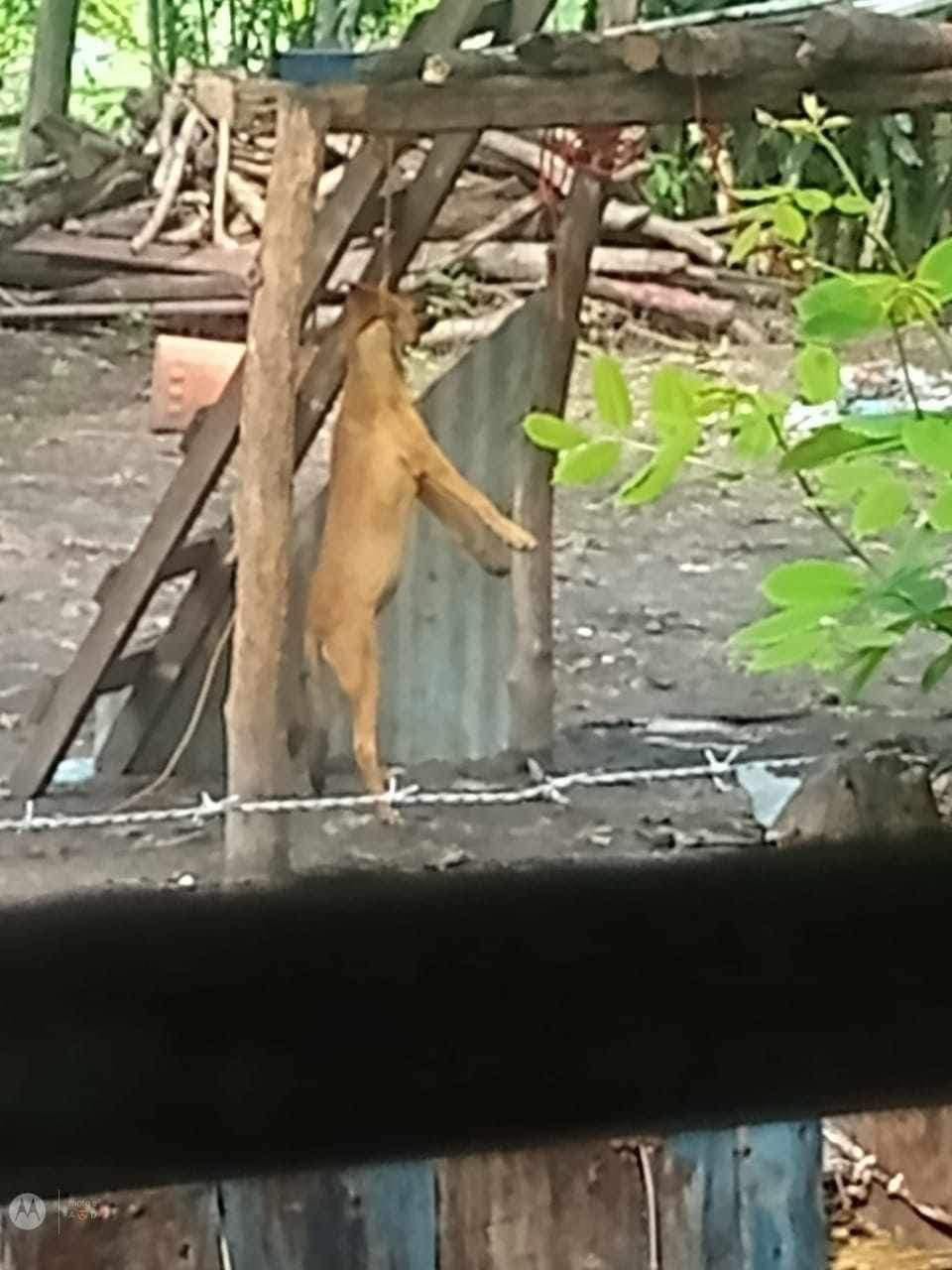 En la fotografía se muestra a un perro criollo color café colgado de una cuerda amarrada a su cuello, apenas sostenido por sus patas traseras para no morir.