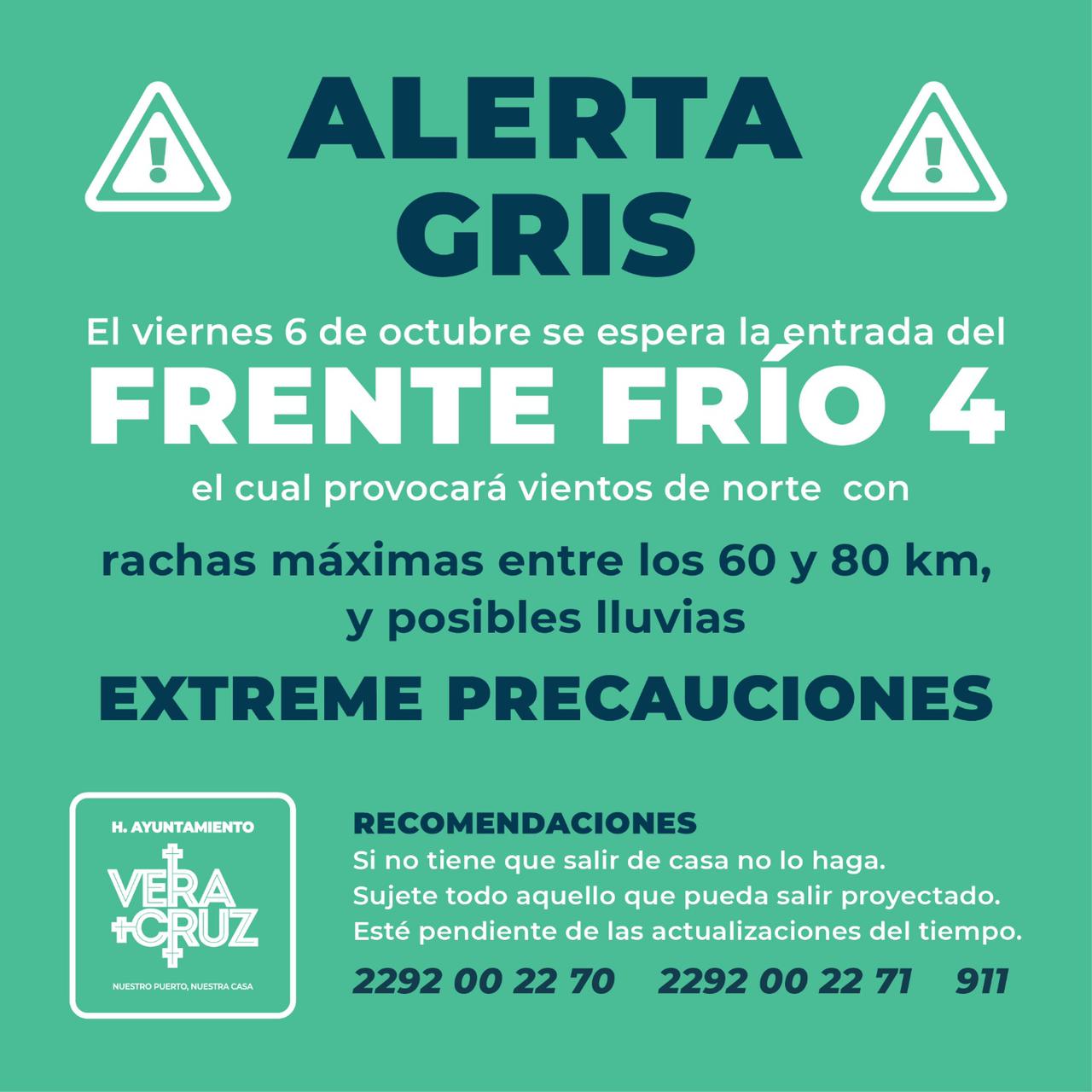 *Veracruz, Ver., 04 de octubre de 2023.-* El Gobierno Municipal de Veracruz, a través de la Unidad de Protección Civil, informa sobre la Alerta Gris por la entrada del Frente Frío número 4 en el puerto de Veracruz.