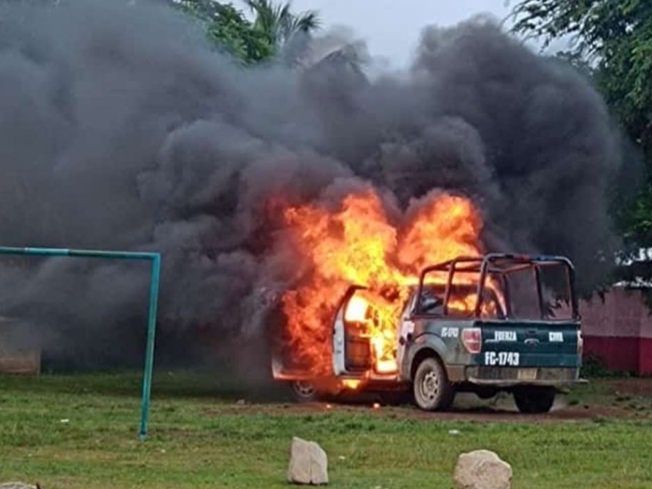 Los manifestantes le prendieron fuego a una de las camionetas que quedó envuelta en llamas en medio de la cancha del futbol de esa población, por lo que tuvieron que llamar a equipos antimotines para controlar la situación.