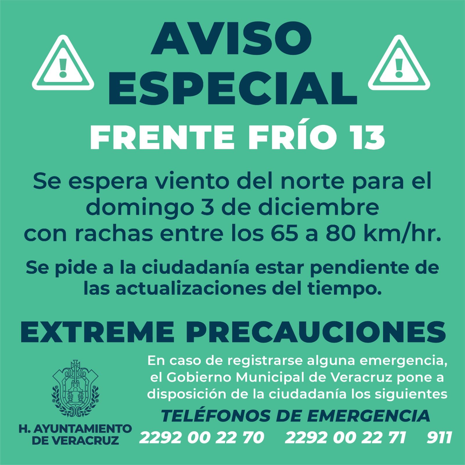 *Veracruz, Ver, 03 de diciembre de 2023.-* El Gobierno Municipal de Veracruz difunde un aviso especial por la entrada del Frente Frío número 13 en el Puerto de Veracruz.