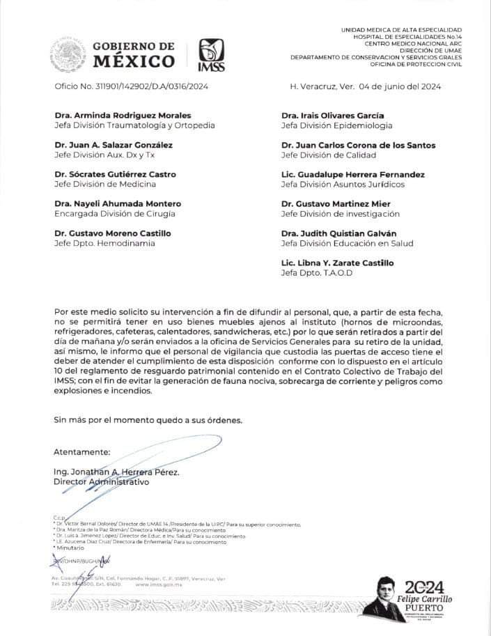 En represaría, las 11 divisiones que están en ese hospital enviaron un comunicado al personal fechado el 4 de junio de este 2024, para informar que a partir de ese momento quedaba prohibido el ingreso de bienes inmuebles que no era propiedad del Seguro.