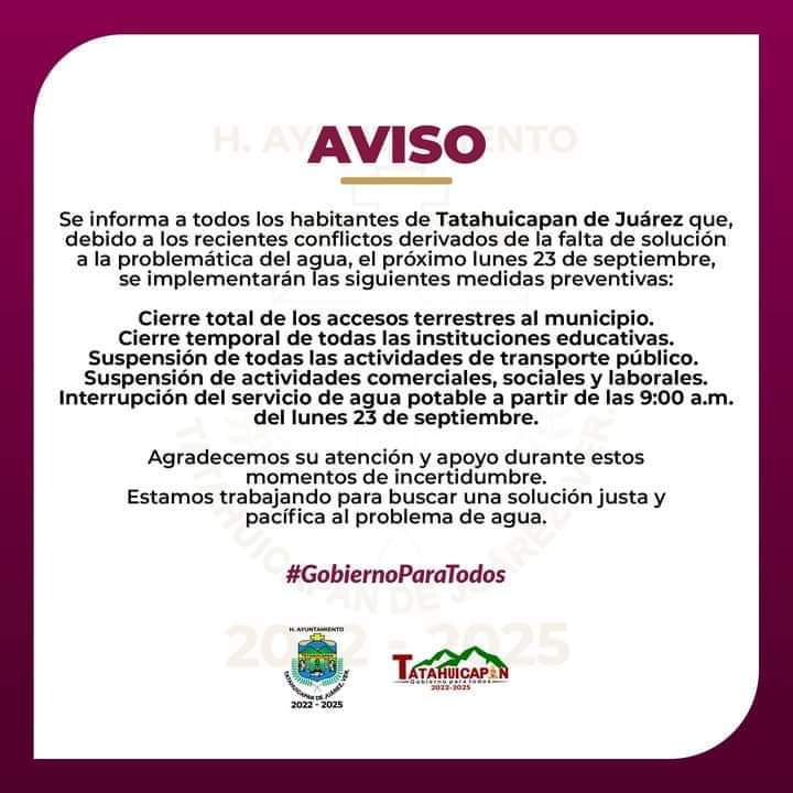 Apenas, este domingo se dió a conocer la suspensión de servicios públicos en la cabecera municipal.