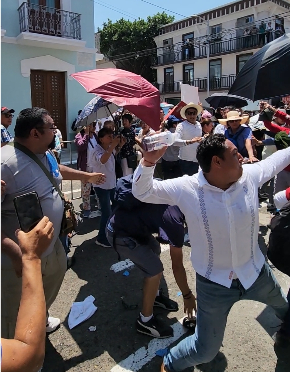 “¡Dictador! ¡Dictador!” Gritaban los manifestantes que expresaban así su repudio ante la reforma al poder judicial…alguien dentro de la manifestación lanzó una botella que por poco da en el mandatario y que finalmente fue Cuitláhuac García quien logró agarrarla.