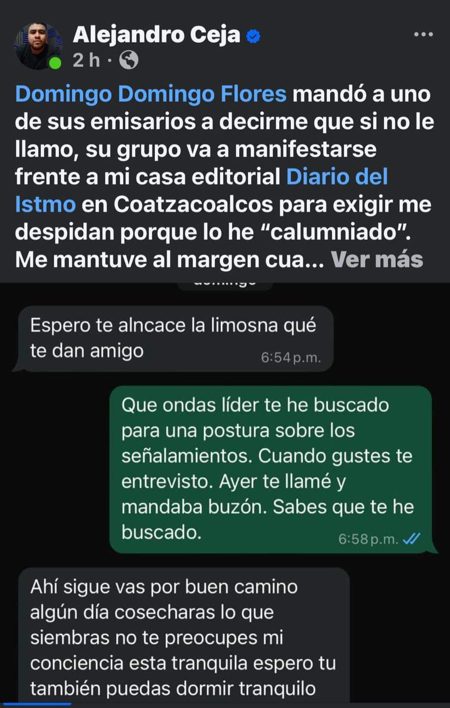 Reprobamos las amenazas que ha realizado este personaje a través de terceros, “mensajeros” que, intentan únicamente desestabilizar a Alejandro Ceja, quien ha publicado en Diario del Istmo, medio para el que trabaja, declaraciones y acusaciones grabadas, nunca sacadas de la manga o de la imaginación.