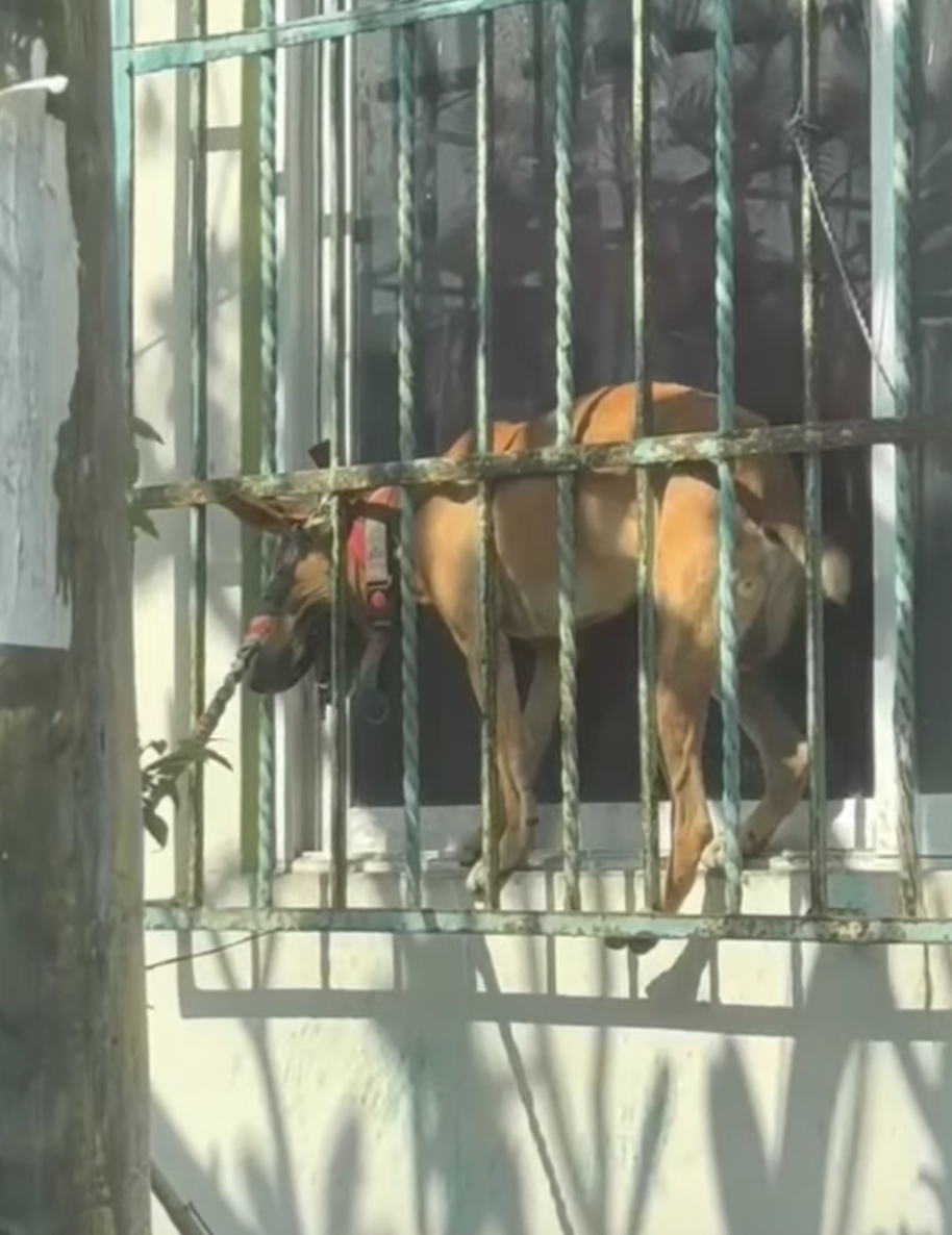 En las imágenes compartidas muestran a un perrito en clara desnutrición amarrado a una protección de una ventana en donde le pegaba todo el sol y sin agua ni comida.