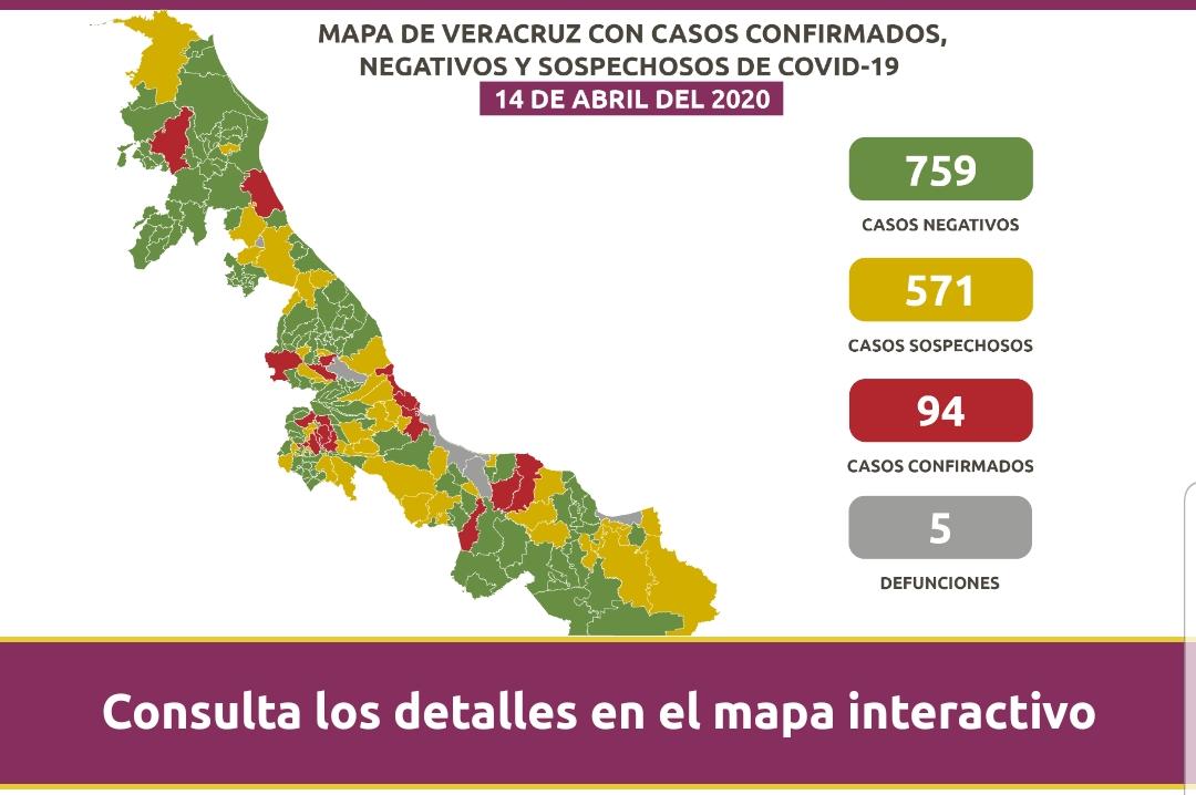 El número de positivos es de 94 en 20 municipios (45 mujeres y 49 hombres, con edades entre 6 y 83 años): Veracruz 33, Boca del Río 16, Coatzacoalcos 8, Poza Rica 6, Xalapa 5; Alvarado, Córdoba, Emiliano Zapata, San Andrés Tuxtla y Tlacotalpan 2; Amatlán de los Reyes, La Antigua, Coatepec, Coscomatepec, Fortín, Ixhuatlán del Café, Ixtaczoquitlán, José Azueta, Medellín, Orizaba, Perote, Río Blanco, Santiago Tuxtla, Tantoyuca, Tuxpan y Úrsulo Galván 1. (defunciones en Tlacotalpan, Emiliano Zapata, Poza Rica, Alvarado y Coatzacoalcos).