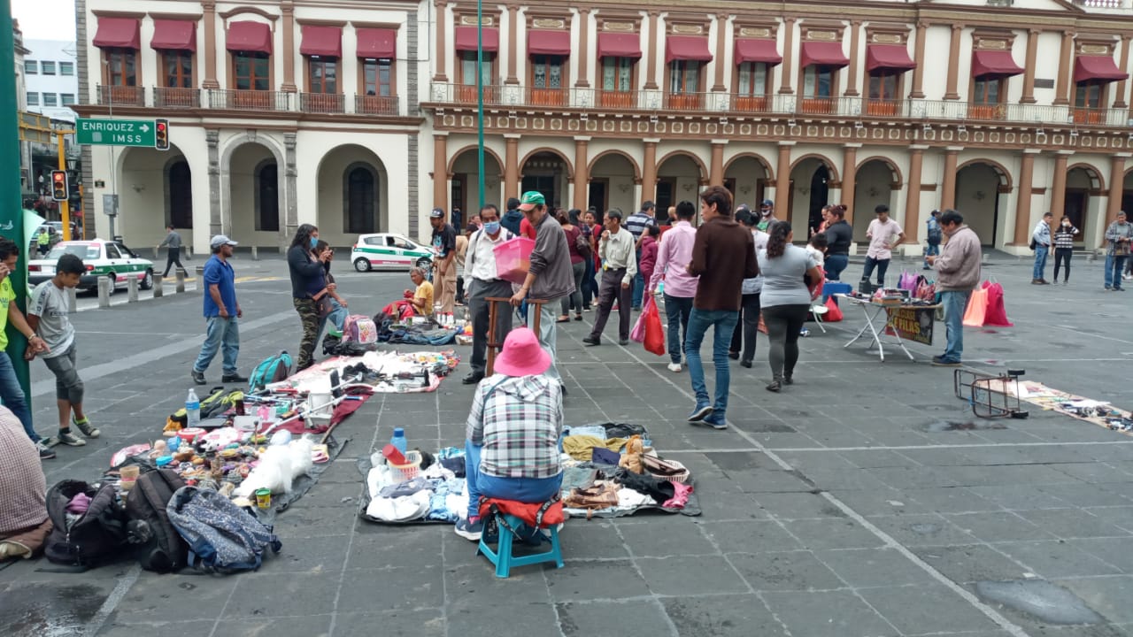 Vendedores de chácharas de diversas partes de la capital, se manifestaron en la Plaza Lerdo colocando sus productos, en protesta porque el ayuntamiento de Xalapa no les permite trabajar como medida de prevención para evitar la propagación del Covid-19.