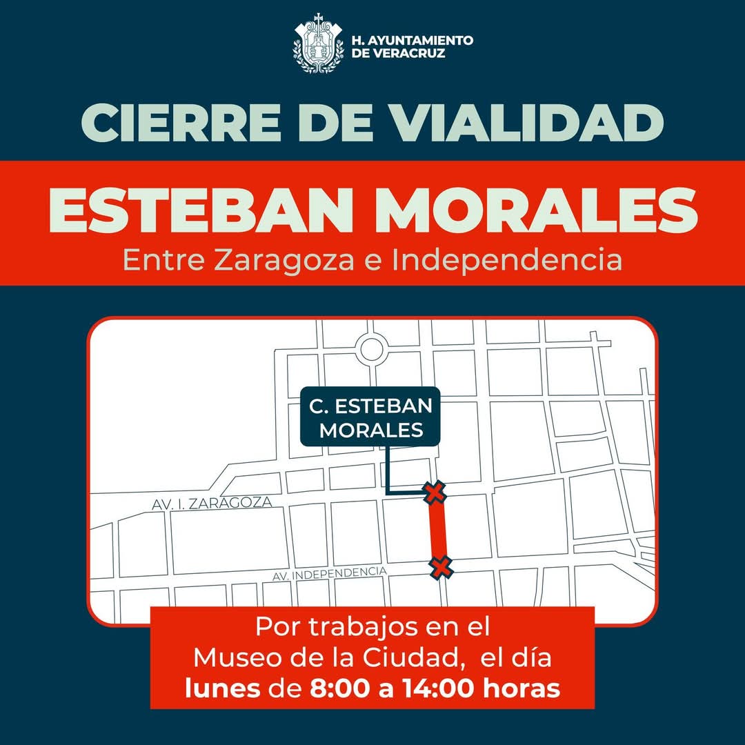 *Veracruz, Ver., 02 de marzo de 2025.-* El Ayuntamiento de Veracruz informa que, debido a obras en el Museo de la Ciudad, el día lunes 03 de marzo, habrá un cierre vial en la calle Esteban Morales, entre las avenidas Zaragoza e Independencia, en el Centro Histórico.