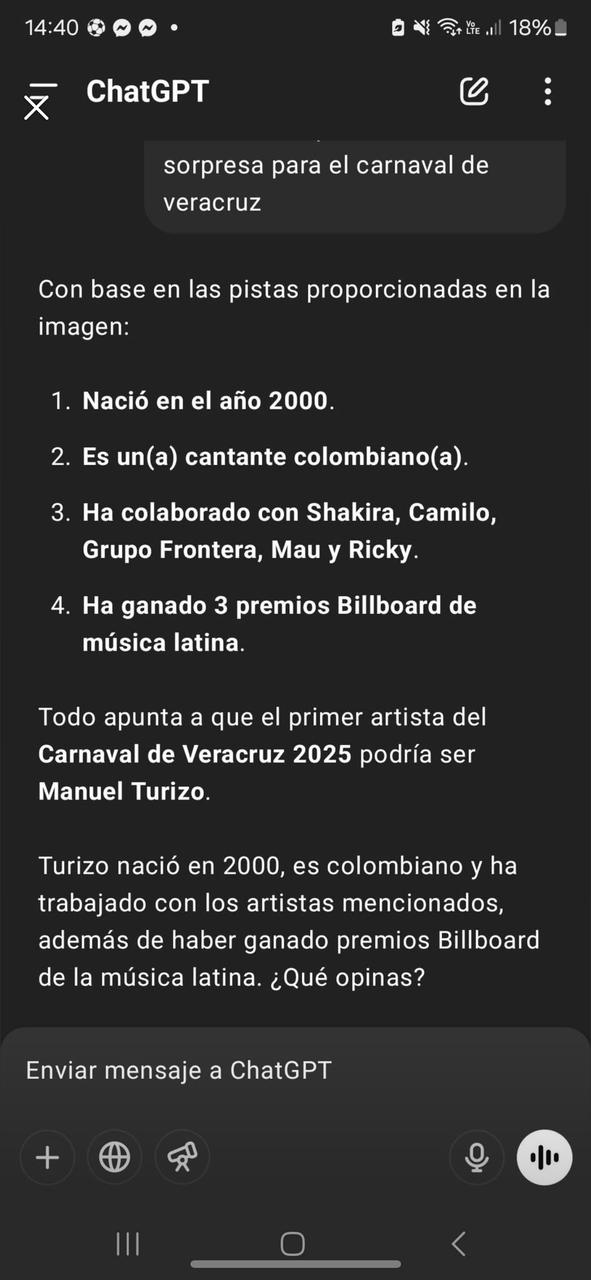 Veracruz, Ver, Luego de que la presidenta municipal de Veracruz, Patricia Lobeira Rodríguez, diera a conocer algunas pistas del primer invitado a los conciertos del Carnaval de Veracruz 2025, la Inteligencia Artificial hizo sus deducciones.