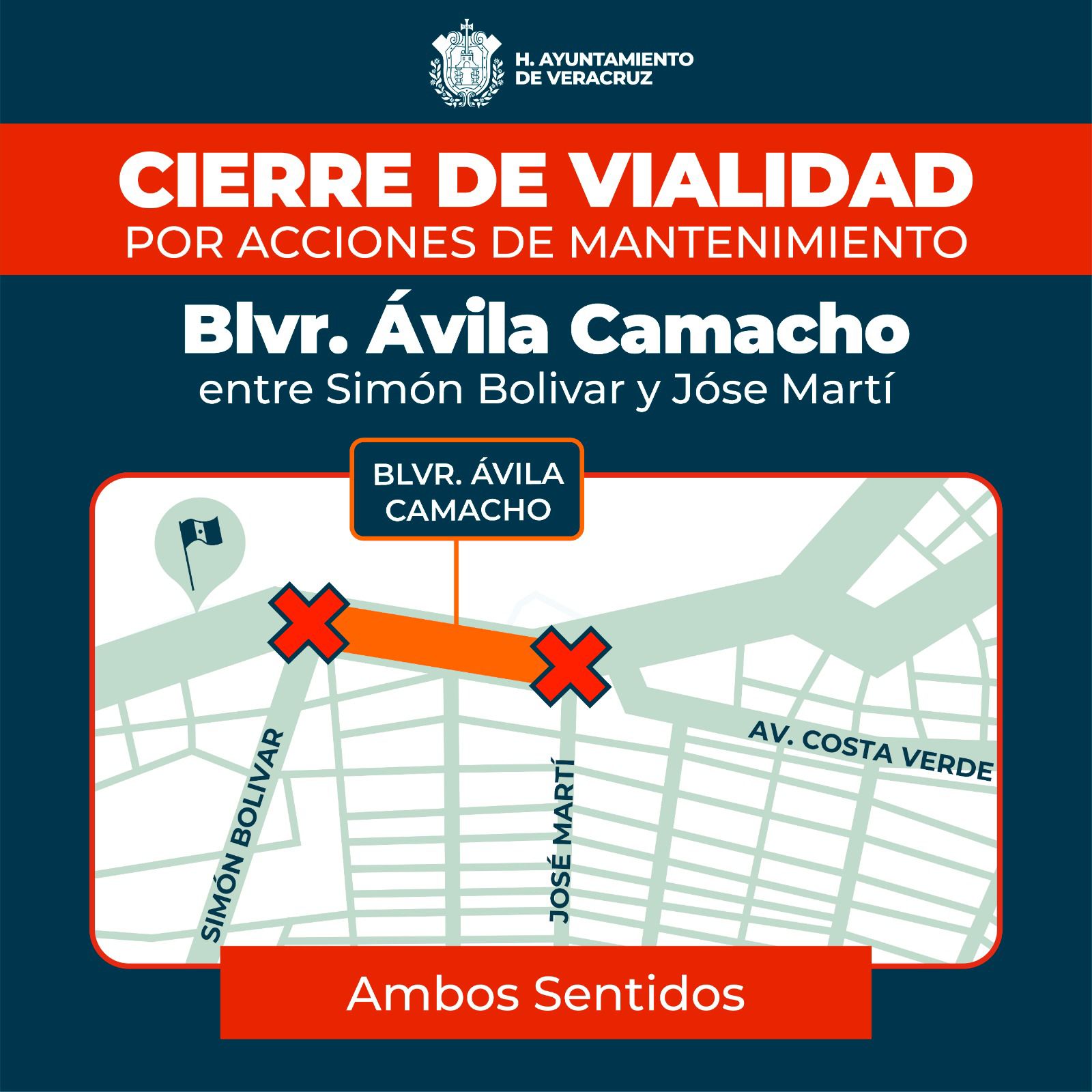 *Veracruz, Ver., 21 de octubre de 2025.-* El Ayuntamiento de Veracruz informa a la ciudadanía que, a partir de hoy, debido a labores de mantenimiento, permanecerá cerrado el Bulevar Manuel Ávila Camacho, en el tramo comprendido de Simón Bolívar a Martí, en ambos sentidos de circulación.