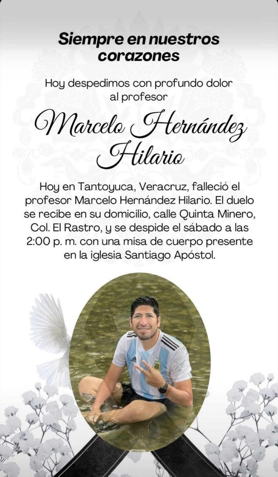Veracruz, Ver. Marcelo Hernández Hilario, maestro de educación primaria en una escuela de la ciudad de Tantoyuca, en el norte del estado de Veracruz, fue asesinado de varios disparos cuando iba saliendo de su casa con rumbo a su trabajo.