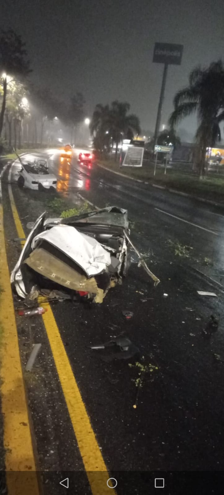 Un automóvil quedó partido en dos tras chocar contra un poste en la avenida Lázaro Cárdenas, frente al centro comercial Plaza Américas, municipio de Xalapa; el conductor resultó ileso.