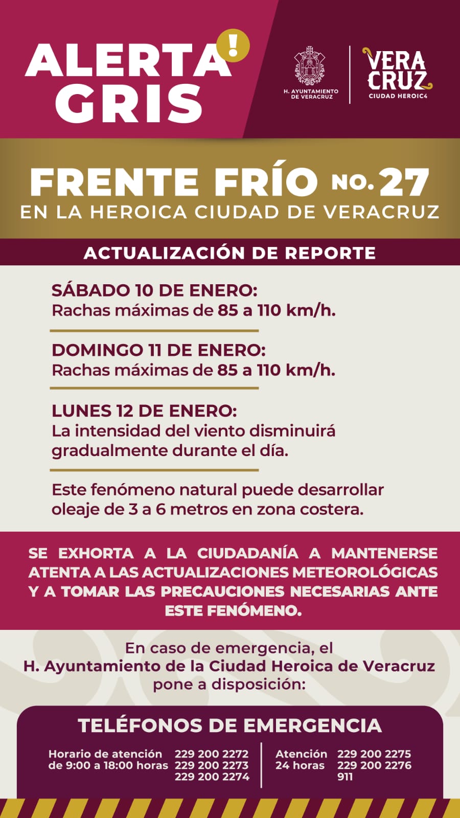 *** El sistema frontal ingresará el sábado 10 de enero después del mediodía, con efectos durante la tarde-noche, generando evento de norte, algunas lluvias y descenso de temperatura. La Dirección de Protección Civil del H. Ayuntamiento de Veracruz informa que se prevé evento de norte, lluvias y descenso de temperatura el próximo sábado 10 de enero, por lo que se exhorta a la población a mantenerse atenta a la información oficial y seguir las recomendaciones de las autoridades para prevenir accidentes y daños. Ante estas condiciones, se recomienda a la población: * Verificar y reforzar techos de viviendas y estructuras. * Asegurar lonas, anuncios, ventanas y objetos sueltos. * No colocar materiales pesados sobre láminas. * Revisar instalaciones de gas y electricidad. * Retirar objetos de azoteas, balcones y cornisas. * Resguardar a las mascotas en un lugar seguro. * Tapar y asegurar materiales como arena, grava, madera y otros objetos sueltos. * Limpiar azoteas, canaletas, alcantarillas y calles para evitar obstrucciones por lluvias. * Suspender trabajos al aire libre, en alturas, sobre escaleras, andamios u otras estructuras inestables. * No sacar la basura fuera del horario del camión recolector. Se prevé que el evento de norte genere rachas de viento de entre 90 y 110 km/h, por lo que se exhorta a la ciudadanía a evitar actividades al aire libre y acuáticas, no salir a navegar y vigilar los amarres o anclajes de embarcaciones.