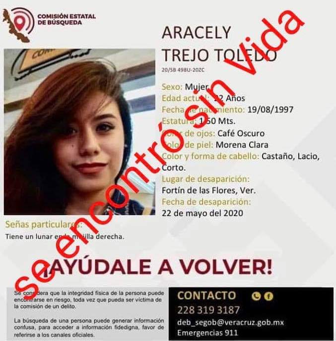 Al hacer la identificación, la victima resultó ser Aracely Trejo Toledo de 22 años que estaba desaparecida desde el 22 de mayo de este 2020, cuando salió en su casa de Fortín de las Flores, en la conurbación de Córdoba-Orizaba.