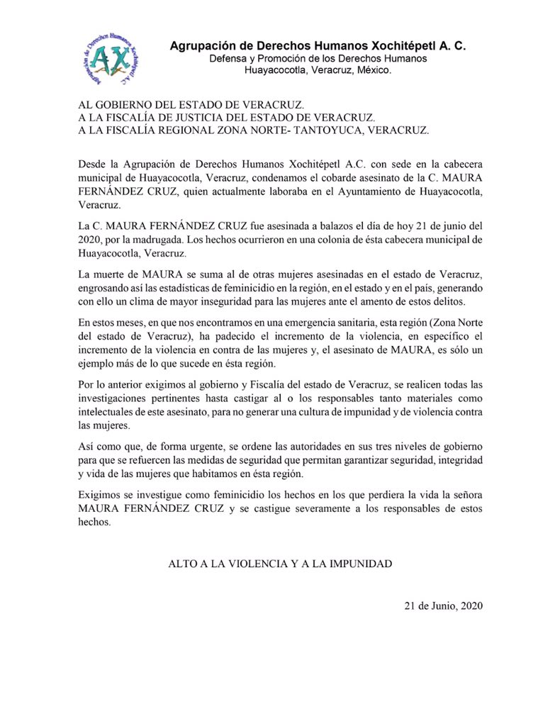 En la misiva exponen que la muerte de Maura se suma al de otras mujeres asesinadas en Veracruz, “engrosando así las estadísticas de feminicidio en la región, en el Estado y en el País, generando con ello un clima de mayor inseguridad para las mujeres ante el aumento de éstos delitos”.