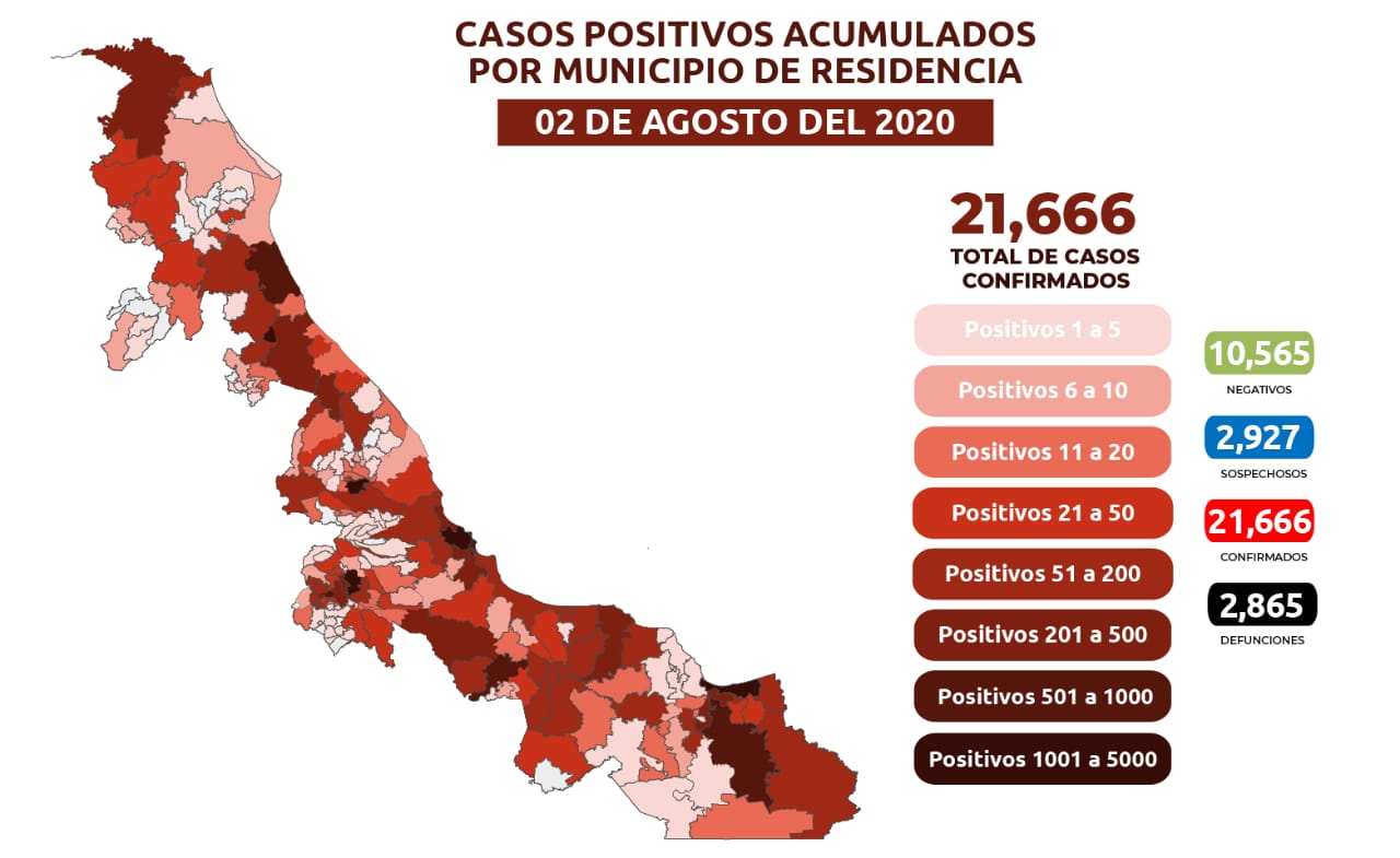 La cifra de positivos acumulados es de 21 mil 666 (+82 nuevos) en 198 municipios; mil 532 de éstos activos; de ellos 9 mil 288 son mujeres y 12 mil 378 hombres; de este total 5 mil 309 han requerido hospitalización y 2 mil 950 han sido dados de alta por mejoría.