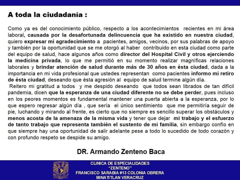 En un comunicado lanzado por la Clínica de Especialidades Zenteno deseó que las agresiones contra los trabajadores de la salud se acaben pronto y así pueda regresar a vivir a Minatitlán.