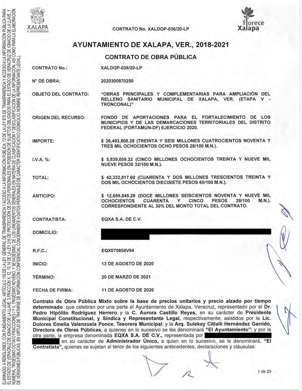 Veracruz, Ver. El ayuntamiento de Xalapa entregó un contrato de obra pública por el monto de 42 millones 839 mil 32 pesos a la empresa EQXA SA de CV, para los trabajos complementarios y de ampliación del relleno sanitario de El Tronconal.