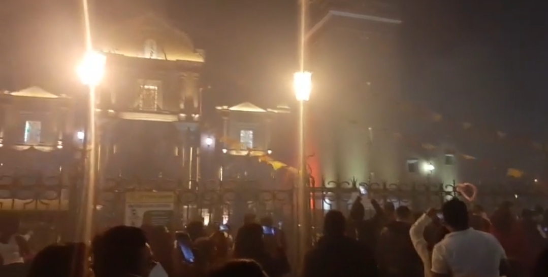 Sin restricciones sanitarias, las personas acudieron sin cubrebocas y entre tumultos llenaron el atrio y frente a la catedral para ver el espectáculo de juegos pirotécnicos.