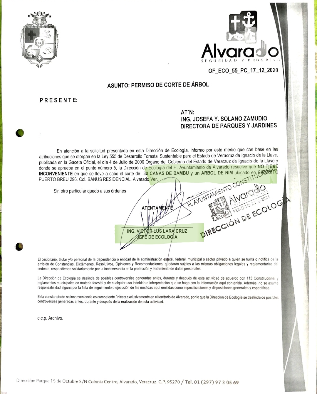 Dentro de la poca documentación que tiene pública el municipio de Alvarado se constata que, en octubre del 2020, Banús solicitó de manera formal a la dirección de Parques y Jardines la autorización de corte de un árbol de Neem, originario de La India y 30 cañas de bambú.