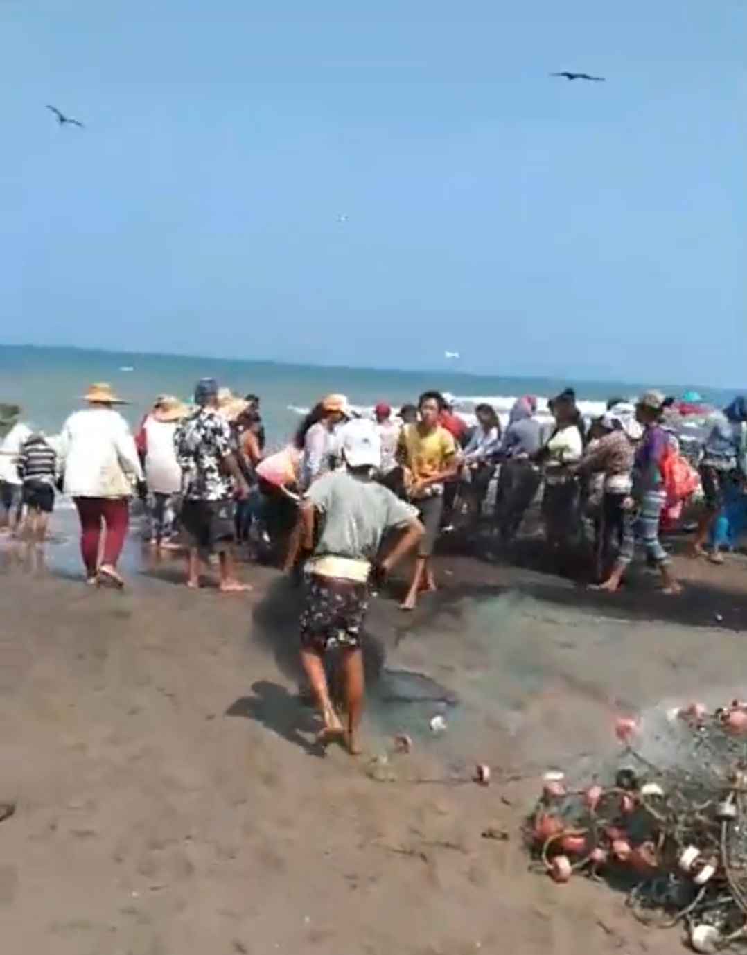 Pequeños y adultos tiraron de la red cerca de las 14:00 horas, con un calor de casi 40 grados, los pescados llenaron dos bateas completas de las camionetas que los transportan al mercado de pescaderías.