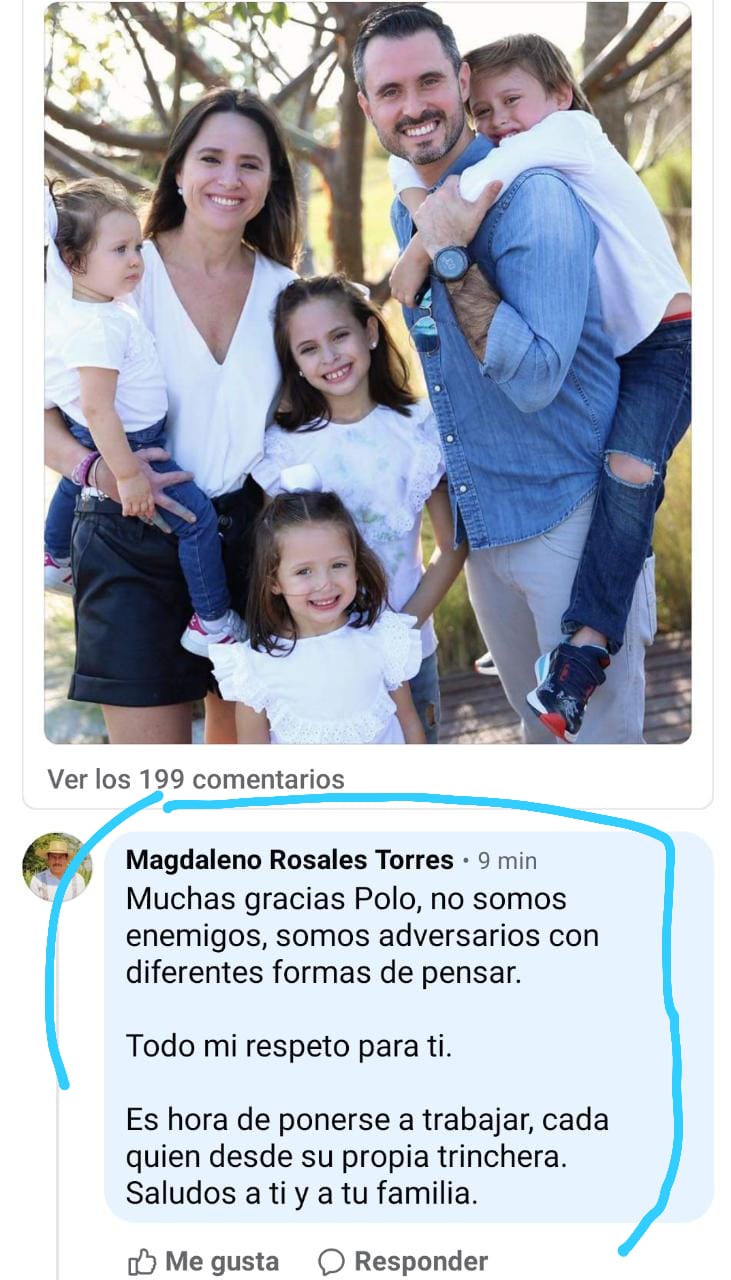 “Muchas gracias Polo, no somos enemigos, somos adversarios con diferentes formas de pensar. Todo mi respeto para ti. Es hora de ponerse a trabajar cada uno desde su propia trinchera. Saludos a ti y a tu familia”.