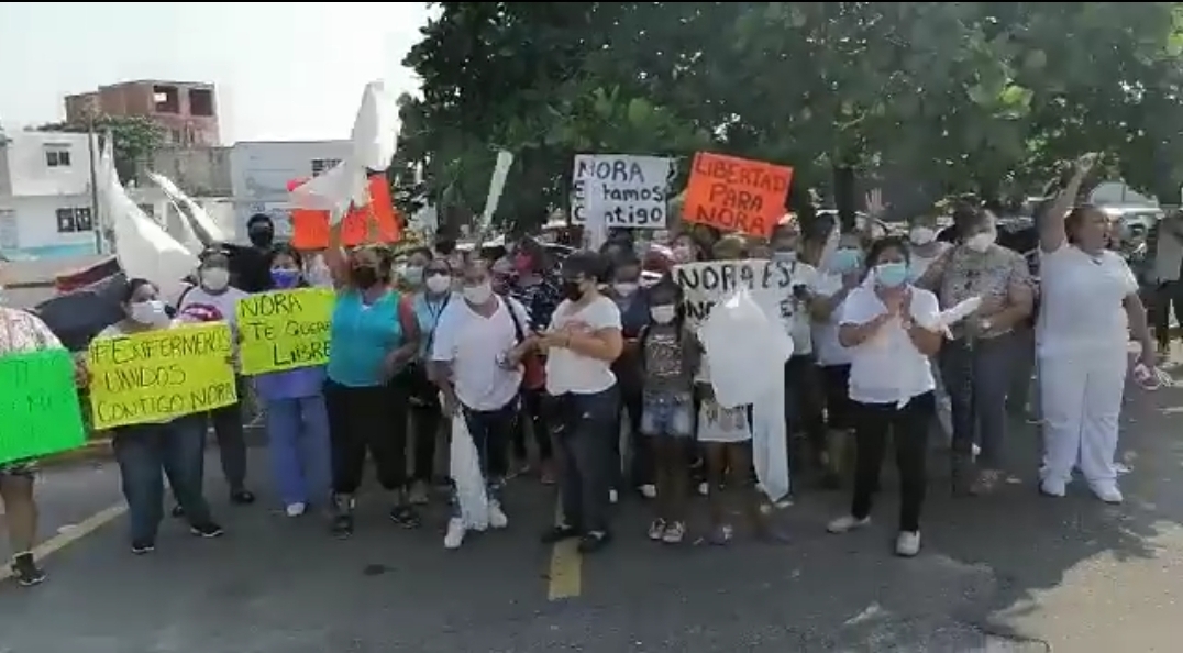 Veracruz, Ver. Trabajadores de la sección 40 del sindicato de trabajadores de la salud del estado de Veracruz protestaron en calles del puerto por la detención de Nora “N”, enfermera naval que es acusada de asesinar a su esposo.