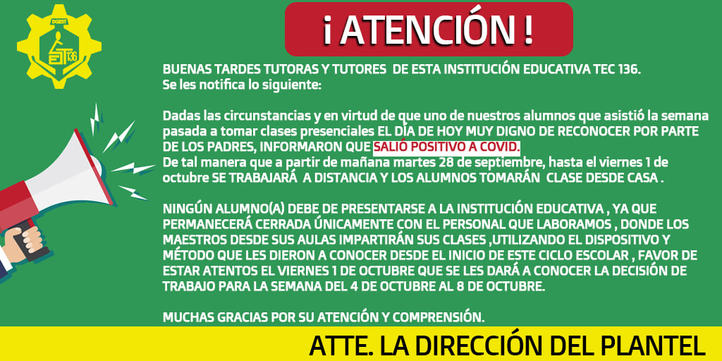 “Ningún alumno (a) debe de presentarse a la institución educativa, ya que permanecerá cerrada únicamente con el personal que laboramos, donde los maestros desde sus aulas impartirán sus clases, utilizando el dispositivo y método que les dieron a conocer desde el inicio de este ciclo escolar”.