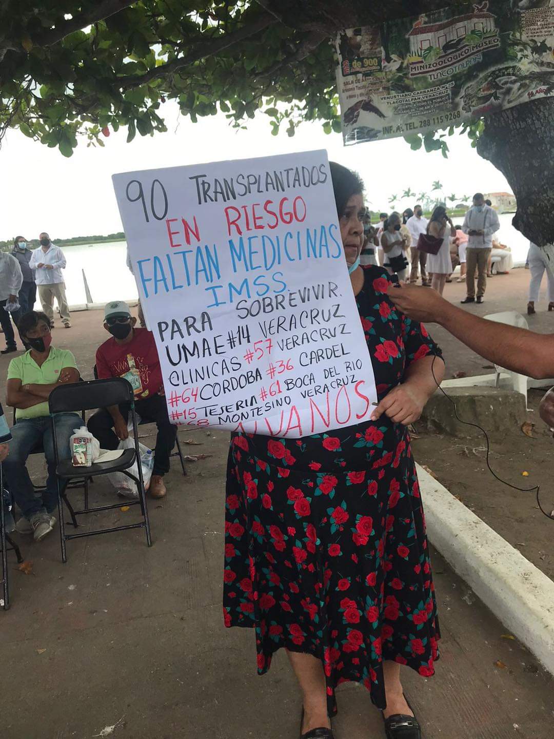 La mujer mostró una cartulina en la que pedía medicinas para más de 90 enfermos que tuvieron un trasplante y sin ellos, afirmó, están en riesgo sus vidas.