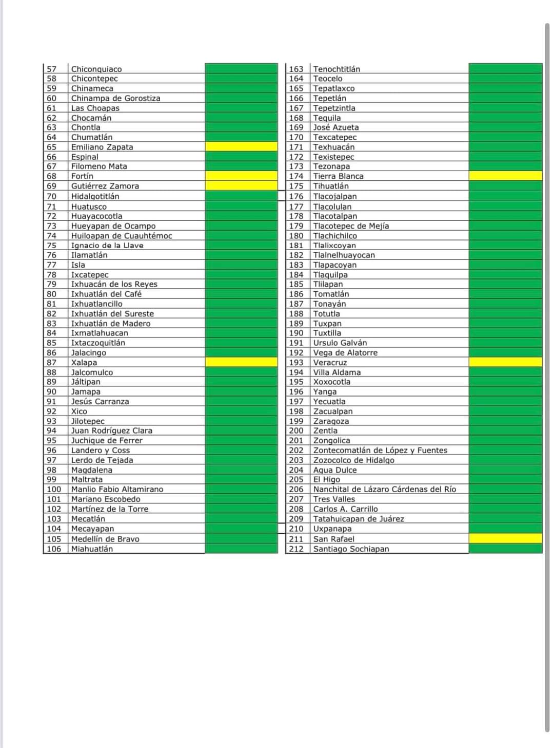 Por su parte, en la zona conurbada permanecen en verde las demarcaciones de Boca del Río, Medellín de Bravo y Alvarado, por lo que en esas localidades las actividades pueden realizare con normalidad.