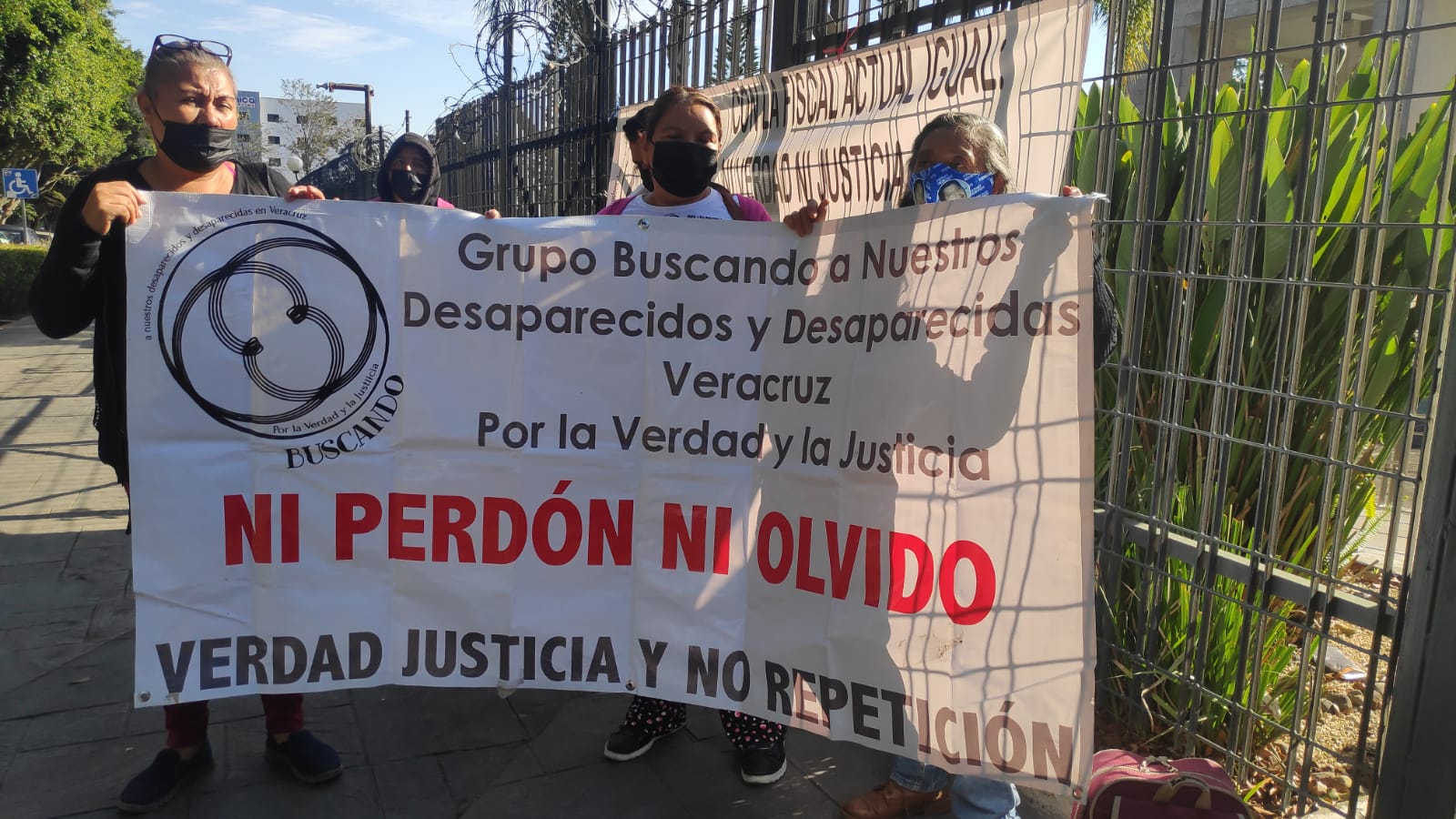 Integrantes del colectivo Buscando a nuestros desaparecidos y desaparecidas Veracruz, protesta afuera del Congreso del Estado para pedir a los diputados hagan una diversas preguntas a la fiscal general, Verónica Hernández Giadáns, quien comparece este lunes.