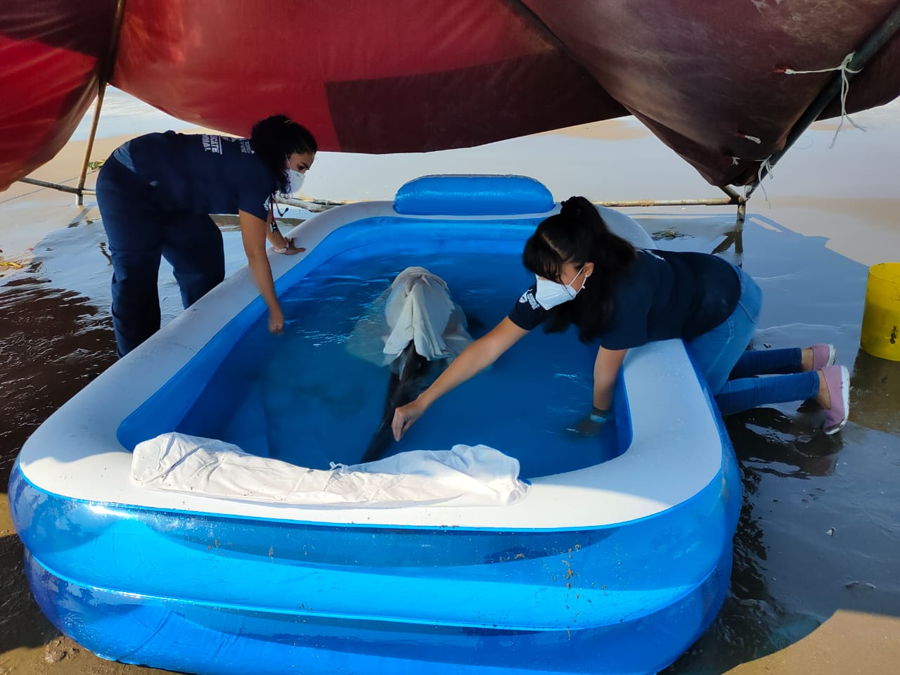 Veracruz, Ver. Biólogos del Acuario de Veracruz luchan en Coatzacoalcos por salvar la vida de un delfín hembra que quedó varado la semana pasada en playas de esa ciudad del sur del estado.