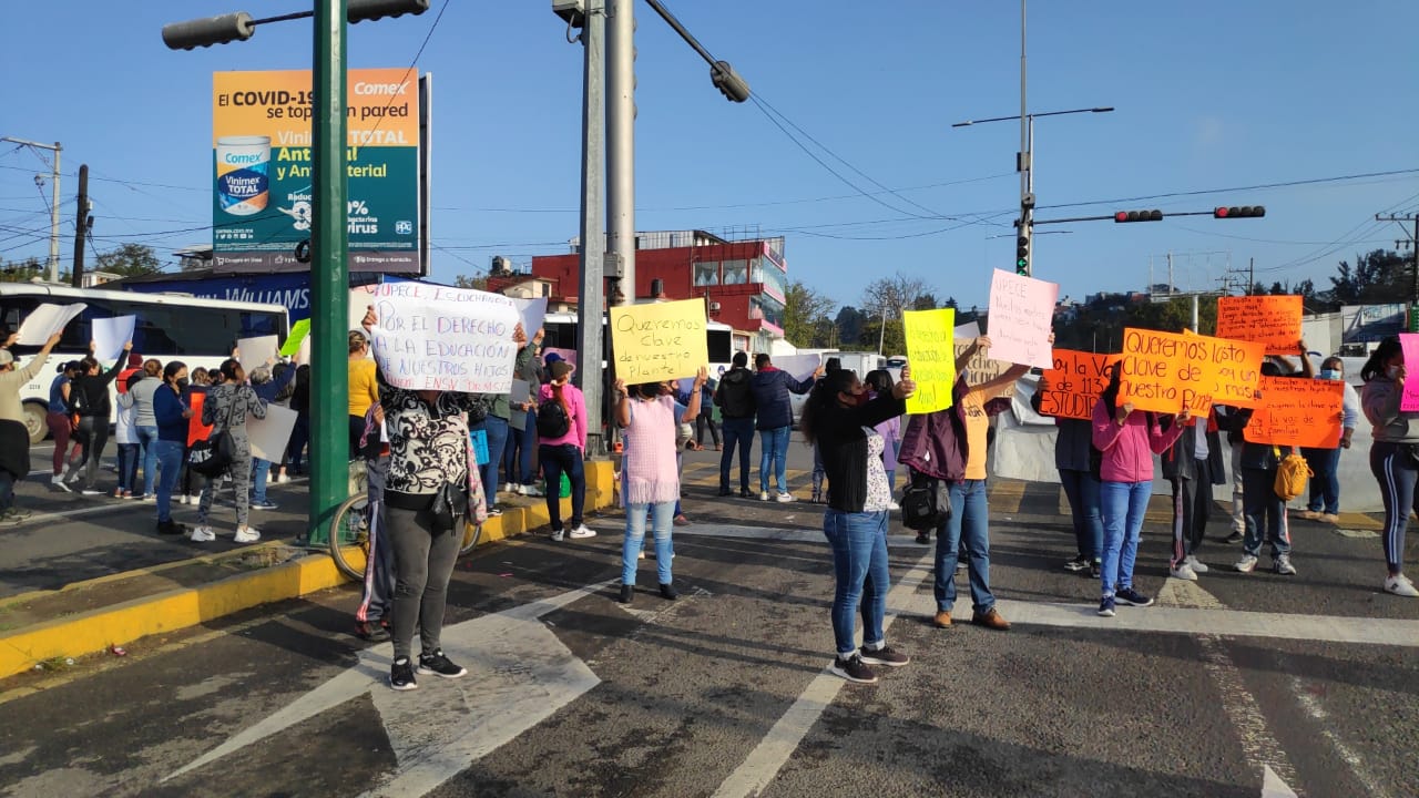 Padres de familia juntor con estudiantes de la Escuela Telesecundaria Anexa a la Escuela Normal Veracruzana "Manuel Suárez Trujillo", bloquearon de manera parcial el bulevar Xalapa-Banderilla, a la altura del campo de la colonia 21 de marzo, en demanda de la clave escolar.