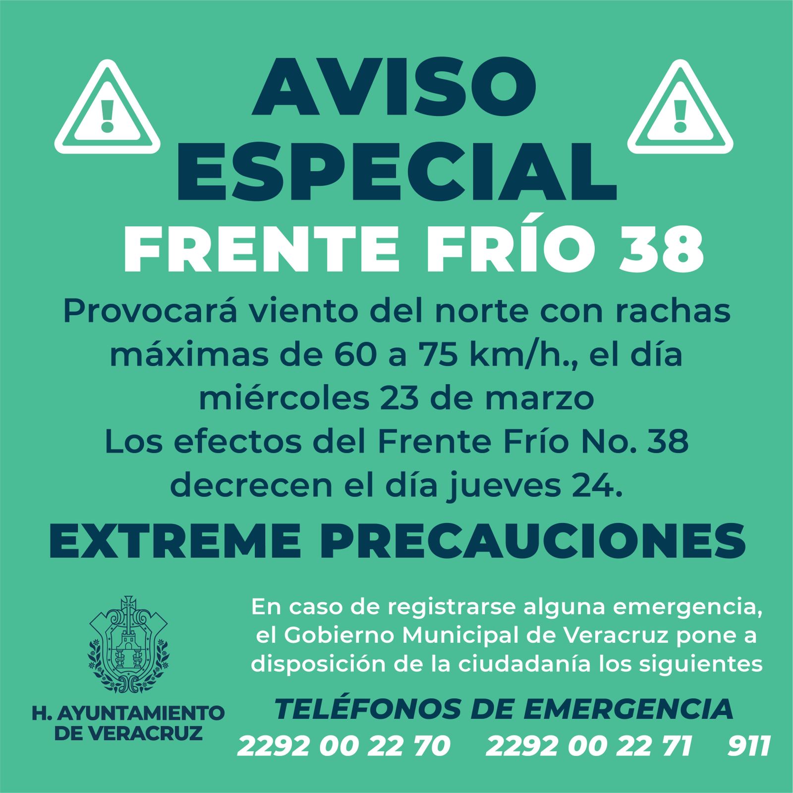 El Gobierno Municipal de Veracruz, a través de la Unidad de Protección Civil, difunde el aviso especial sobre la entrada del Frente Frío No. 38, el cual provocará viento del norte con rachas máximas de 60 a 75 kilómetros por hora (km/h) el día de mañana, miércoles 23 de marzo.