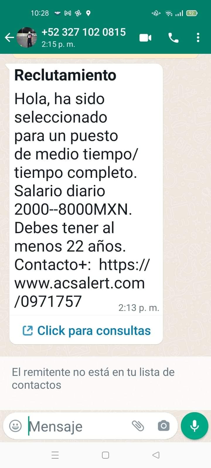 Veracruz, Ver. Usuarios de redes sociales comenzaron a advertir por medio de grupos de Facebook a que no hagan caso a los mensajes que son enviados a celulares de personas en la región de Veracruz en los que invitan a una supuesta oferta de trabajo.
